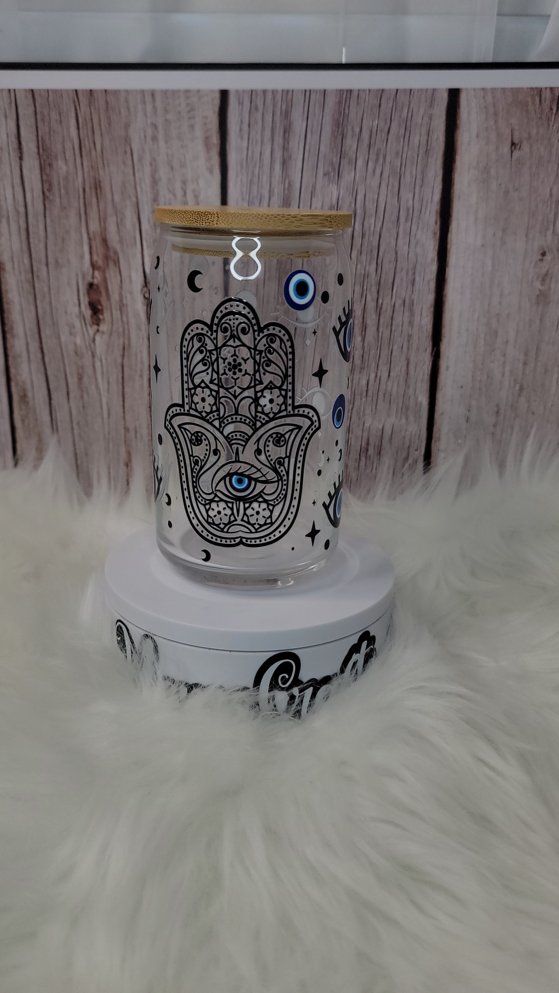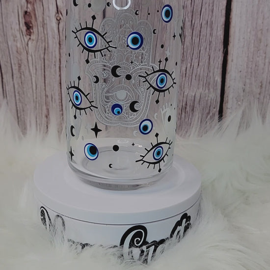 Hamsa Glass can 16 oz | With lid and glass straw